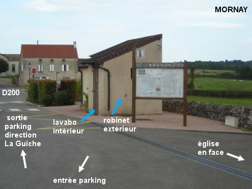 Les toilettes sont situées à côté de l'église. Sur la D200 en direction de La Guiche, juste après l'église tourner à droite dans l'allée desservant un petit parking. Le petit bâtiment des toilettes (qui comprend aussi un abribus) est implanté sur la droite juste avant la sortie du parking (circulation en sens unique). N.B. : En plus du lavabo à l'intérieur, il y a un robinet extérieur fixé sur le mur qui fait face à l'église.