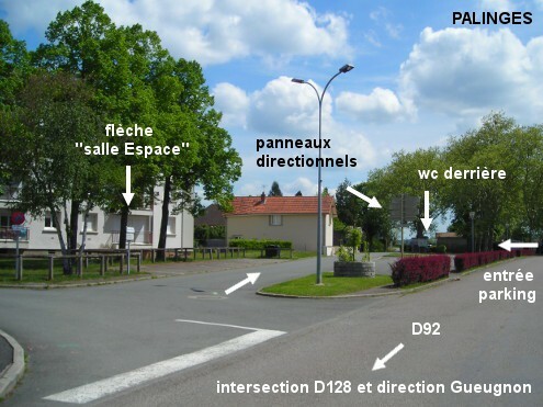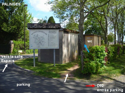 Ces toilettes sont situées à côté d'un grand parking au bord de la D92, non loin de la ''salle Espace'' et du vieux cimetière, à 160 mètres de l'intersection D92 / D128. Sur la D92 en provenance de Gueugnon (en direction de Charolles via la D985), juste après l'intersection avec la D128, soit prendre à gauche en suivant la flèche ''salle Espace'' la rue qui longe par la gauche le très grand parking, soit entrer sur le parking un peu plus loin au niveau du panneau P bleu, pour trouver juste après l'extrémité du parking le bâtiment des toilettes (derrière un grand panneau touristique et un transformateur EDF) entre des haies arbustives et desservi par un court chemin de terre. N.B. : La cabine WC est fermée de 22h à 6h (les urinoirs à l'arrière restent quant à eux accessibles), et le lavabo à l'intérieur est relativement petit.