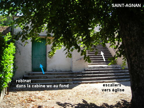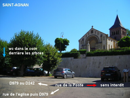 Les toilettes sont situées au fond d'un parking à proximité de l'église. 1a) En provenance des Guerreaux par la D251, on peut, avant d'arriver sur la D979 (route à grande circulation) prendre sur la branche droite d'un carrefour en Y une petite route (en mauvais état) presque parallèle à la D979 et qui la surplombe. On arrive ainsi, à l'issue d'une portion finale en sens unique, sur la rue de la Poste dans son prolongement, avec à gauche la rue de l'église qui monte depuis la D979, et à droite la place arborée en contrebas de l'église. Les toilettes (totalement masquées par les arbres) se trouvent au fond à gauche de cette place, à gauche des escaliers qui montent vers l'église. Le robinet se trouve dans la cabine WC turc. 1b) Si l'on préfère éviter la petite route au mauvais revêtement et que l'on continue jusqu'à la D979, on verra plus loin sur la droite, au début de la rue de l'église (WC à 70 mètres), une flèche indiquant l'église. 2) En provenance de Neuvy-Grandchamp par la D242, après avoir passé la Mairie côté gauche, tourner à gauche dans la rue de la Poste, pour trouver 110 mètres plus loin la place arborée au fond de laquelle il y a les toilettes. N.B. : Si l'on s'est trompé au carrefour, on débouche sur la D979 et là une flèche indiquant l'église nous incite à faire demi-tour.
