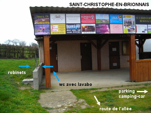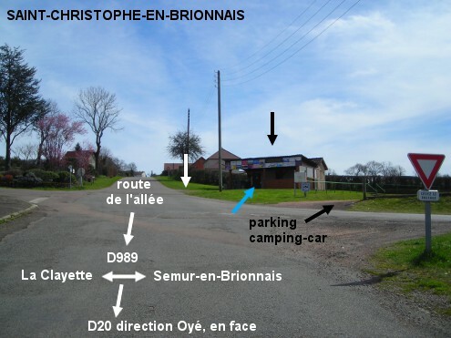 L'aire pour camping-car (fléchée) est située dans une rue secondaire en périphérie du village, à 240 mètres de la D989 direction La Clayette et de la D20 direction Oyé. 1) Sur la D20 en provenance d'Oyé, traverser la D989 pour monter dans la petite route en face et trouver l'aire pour camping-car 240 mètres plus loin, côté droit, derrière l'intersection avec une rue adjacente. A gauche du parking, le grand chalet en bois avec auvent comporte des toilettes. La porte de gauche (WC dames) donne dans une cabine WC avec lavabo (N.B. : Les WC hommes étaient indisponibles). De plus, il y a sur le muret bordant le côté gauche de la terrasse, un duo de robinets (accompagnés d'une pancarte actuellement manuscrite : eau potable). 2) Sur la D20 en provenance de Ligny-en-Brionnais, au carrefour avec la D989, tourner à droite, puis peu avant la sortie du village tourner à droite dans la rue qui est en face de la suite de la D20, pour trouver les robinets et les toilettes de l'aire pour camping-car. P.S. : Un itinéraire cyclo balisé permanent passe juste à côté de cette aire.
