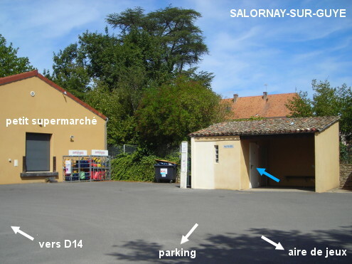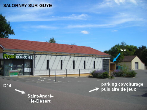 Ces toilettes se trouvent à proximité d'une aire de jeux et sur le parking pour le covoiturage (fléché) situé au bord de la D14. Sur la D14 en provenance de Saint-André-le-Désert, après l'intersection avec la D980 et un peu plus loin, tourner à droite sur le parking devant une supérette, le parking pour le covoiturage étant quant à lui sur la droite et vers le fond, de même que l'aire de jeux. Une fois engagé sur le parking, on trouvera le bâtiment des toilettes sur la gauche et derrière le grand bâtiment du petit supermarché de village (à 40 mètres de la D14). La porte des toilettes se trouve dans la partie abritée disposant de bancs.