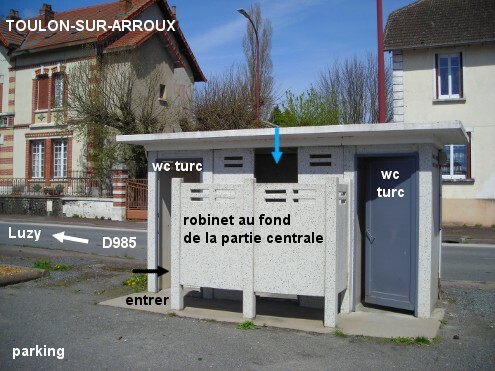 Ces toilettes sont situées au bord d'un immense parking implanté à gauche de la D985 direction Luzy, peu après le pont sur l'Arroux, derrière le carrefour avec la voie C5. Il s'agit de vieilles toilettes de type vespasienne dont l'entrée est située côté parking. Le robinet qui est en service se trouve au fond de la partie centrale (entre les deux cabines WC turcs) dans laquelle il y a les urinoirs. N.B. : Sur le robinet extérieur côté route, l'eau est coupée.