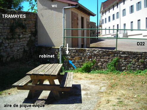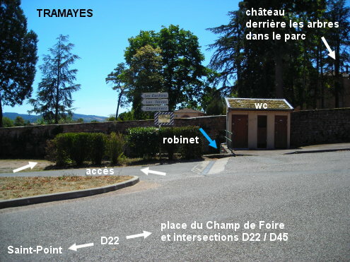 Ces toilettes sont situées à proximité du château et de la grande place jouxtant les deux intersections D22 / D45. Sur la D22 en provenance de Saint-Point, 130 mètres après le panneau marquant le début de la ville (et 100 mètres avant l'intersection nord D22 / D45), on verra sur l'extérieur du virage le petit bâtiment des toilettes sur le côté gauche contre le mur. Il n'y a pas de lavabo et le robinet n'est pas fixé sur le mur extérieur de ces toilettes. Pour le trouver, il faut tourner à gauche juste avant dans le chemin des Carillons et entrer aussitôt à droite derrière la haie sur la zone de pique-nique. Le robinet est à droite sur le mur en contrebas du bâtiment des toilettes (donc à gauche des toilettes et en-dessous).