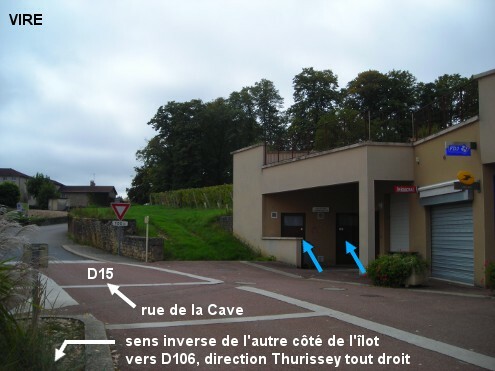 Les toilettes sont situées au centre du village à proximité de la célèbre cave de Viré. 1) Sur la D15 en provenance de Péronne, tourner à gauche en direction du centre bourg (rue de la Cave) pour trouver les toilettes quelques mètres après, côté gauche sous une sorte de porche avant une place. 2) Sur la D15 en provenance de Fleurville, rejointe par la D106 en provenance de Saint-Albain, prendre aussi la direction du bourg puis au carrefour vers la place, tourner à gauche pour arriver dans l'autre sens sur l'emplacement des toilettes, donc situées ici à droite après un îlot central. 3) En provenance du nord par la D106 (Thurissey, ou Lugny via la D55), on arrive au carrefour vers la place précitée dans l'axe de l'îlot central, les toilettes sont donc sur la droite juste après.