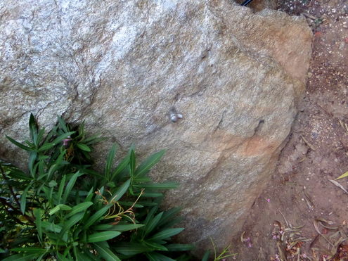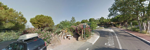 point d'eau (robinet) dans la montée au village de Bormes les Mimosas, avant le carrefour! petit coin tables et assises en marbre. Le robinet est fixé à un énorme caillou.
