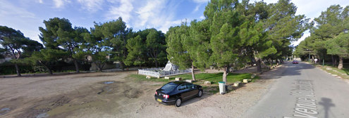 Derrière le monument aux morts, entre le parking et le terrain de pétanque, sous les pins, à 10 m de la route.
