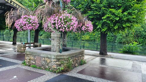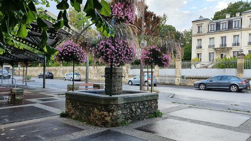 Fontaine publique au milieu des halles du marché d'Andrésy. En face du 36 Boulevard Noël Marc. 4 robinets pour distribuer l'eau.